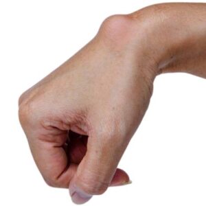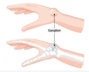 Das Ganglion, im Volksmund „Überbein“, ist die häufigste gutartige Raumforderung am Handgelenk. Es ist meistens von aussen bereits als Vorwölbung erkennbar, am häufigsten streckseitig, aber auch beugeseitig am Handgelenk lokalisiert. Die Grösse kann variieren, es tastet sich prallelastisch und ist über einen Stiel mit dem Gelenk verbunden, über den es mit gallertiger (Gelenk-)Flüssigkeit gefüllt wird. Ein Ganglion kann auch schon Beschwerden machen, wenn es noch nicht von aussen sichtbar ist, man bezeichnet es dann als „okkultes“ Ganglion. Es kann auch in einen Knochen eindringen und diesen teilweise ausfüllen.